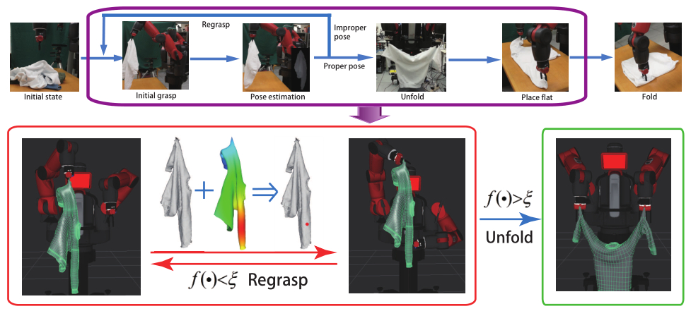 Deformable objects such as garments are highly unstructured, making them difficult to recognize and manipulate. In this paper, we propose a novel method to teach a twoarm robot to efficiently track the states of a garment from an unknown state to a known state by iterative regrasping. The problem is formulated as a constrained weighted evaluation metric for evaluating the two desired grasping points during regrasping, which can also be used for a convergence criterion The result is then adopted as an estimation to initialize a regrasping, which is then considered as a new state for evaluation. The process stops when the predicted thin shell conclusively agrees with reconstruction. We show experimental results for regrasping a number of different garments including sweater, knitwear, pants, and leggings, etc. Keywords:Robotics, garment, regrasping, unfolding Proc. IEEE ICRA 2015, pp.1382-1388. Seattle, May 2015 Paper: PDF(5.2MB)Video: VIDEO(YouTube) |