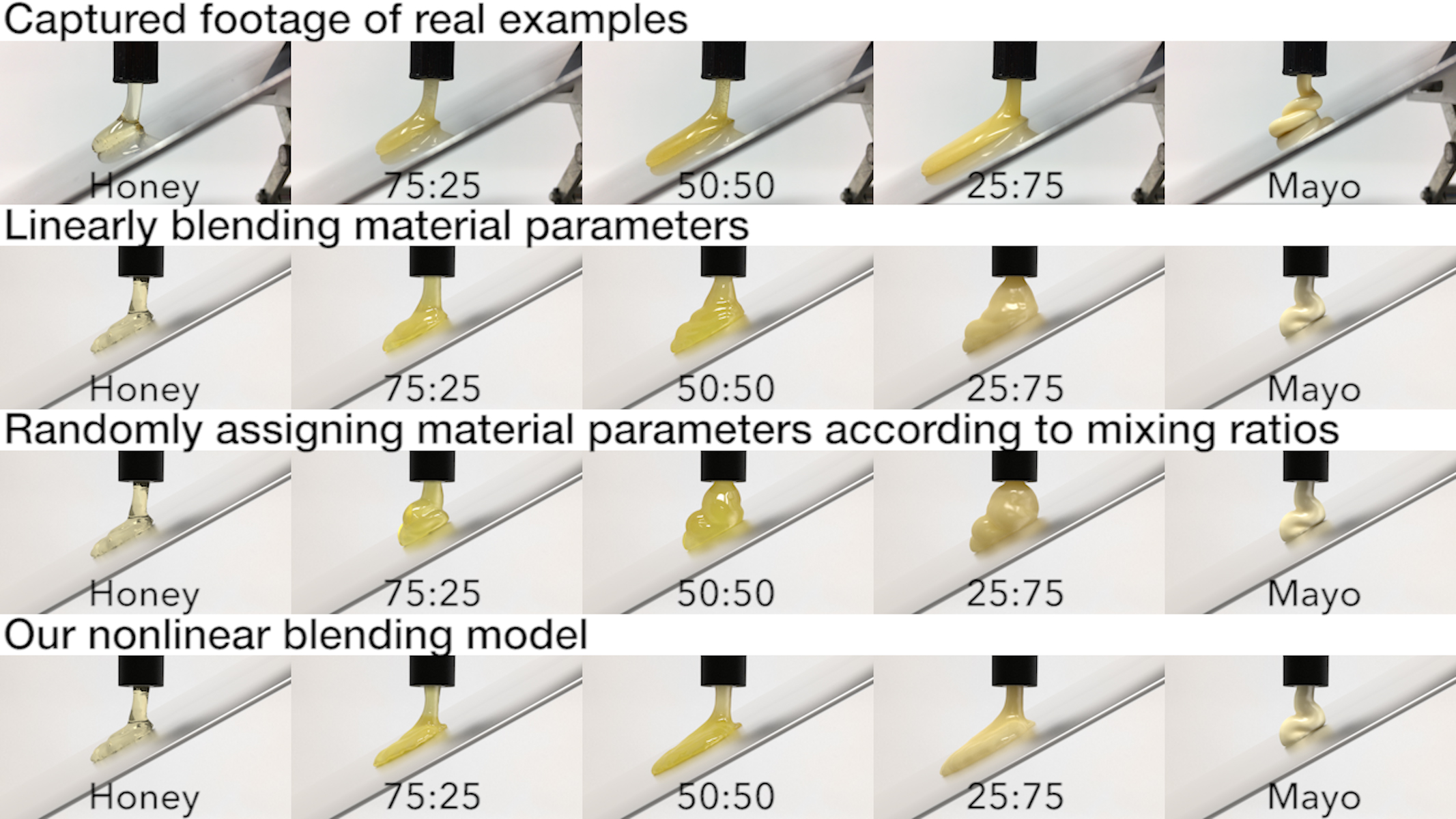 The materials around us usually exist as mixtures of constituents, each constituent with possibly a different elasto-viscoplastic property. How can we describe the material property of such a mixture is the core question of this paper. We propose a nonlinear blending model that can capture intriguing flowing behaviors that can differ from that of the individual constituents. We used a laboratory device, rheometer, to measure the flowing properties of various fluid-like foods, and found that an elastic Herschel-Bulkley model has nice agreements with the measured data even for the mixtures of these foods.We then constructed a blending model such that it qualitatively agrees with the measurements and is closed in the parameter space of the elastic Herschel-Bulkley model.We provide validations through comparisons between the measured and estimated properties using our model, and comparisons between simulated examples and captured footages. We show the utility of our model for producing interesting behaviors of various mixtures. Keywords:Physical simulation, viscoplasticity, nonlinear blending, material point method, shear thinning fluids Acknowledgements:We thank anonymous reviewers, Yuki Yoshida, and Hirotaka Sakamoto for insightful suggestions and discussions, and Louisa Andersen for her help in producing the video. This work was supported in part by JSPS Grant-in-Aid for Young Scientists (A) 17H04682, and JSPS Grant-in-Aid for Scientific Research on Innovative Areas 18H05001. ACM Transactions on Graphics (Proc. of SIGGRAPH 2019), 38(4), 95:1-17, 2019 Paper: PDF(35.4MB)Video: youtube video , High res MP4(235.4MB) BibTex