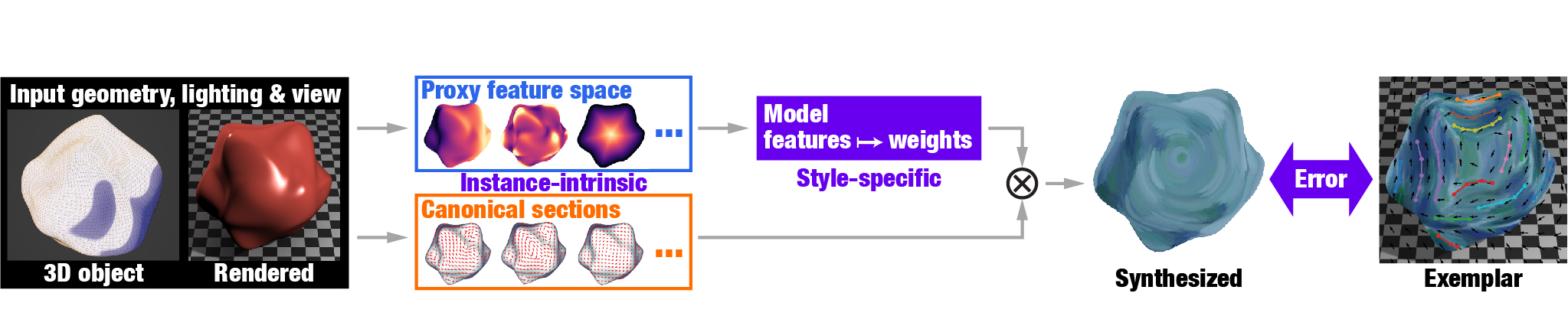 We present stroke transfer, an example-based synthesis method of brushstrokes for animated scenes under changes in viewpoint, lighting conditions, and object shapes. We introduce stroke field for guiding the generation of strokes, consisting of spatially varying attributes of strokes, namely, their orientations, lengths, widths, and colors. Strokes are synthesized as the integral curves of the stroke field. In essence, we separate elements that constitute the artistic stroke into style-specific transferable elements and instance-intrinsic ones. To generate the stroke field, we first compute a set of vector fields that reflect the instance-intrinsic elements and then combine them using style-specific weight functions learned from exemplars, with the weights computed in a proxy feature space shared among a variety of objects. The rendered animation using our method captures time-varying viewpoint, lighting conditions, and object shapes, as well as the artistic style given in the form of exemplars. Keywords:Non-photorealistic rendering, stroke-based rendering, examplebased, stroke transfer, vector field generation Acknowledgements:We thank the anonymous reviewers for their insightful suggestions and discussions. This work was supported in part by a grant from JST FOREST Program, JPMJFR206R, Japan, a JSPS Grant-in-Aid for Scientific Research (A) 18H04106, Japan, and a JSPS Grant-in-Aid for Scientific Research (C) 22K12051, Japan. SIGGRAPH '22 Conference Proceedings, August 7-11, 2022, Vancouver, BC, Canada. doi:10.1145/3528233.3530703 Paper: PDF(74.1MB)Video: youtube video | High res MP4(396.7MB) Supplementary mateiral: PDF(7.3MB) Code: Github repository BibTex